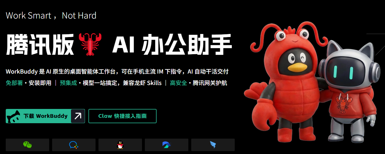 3 月 9 日,先是总部楼下摆摊免费帮近千人装虾,紧接着推出了产品矩阵:QClaw(一键启动包)和 WorkBuddy(免部署桌面工具)。WorkBuddy 完全兼容 OpenClaw 的技能包,多 Agent 并行也不在话下。