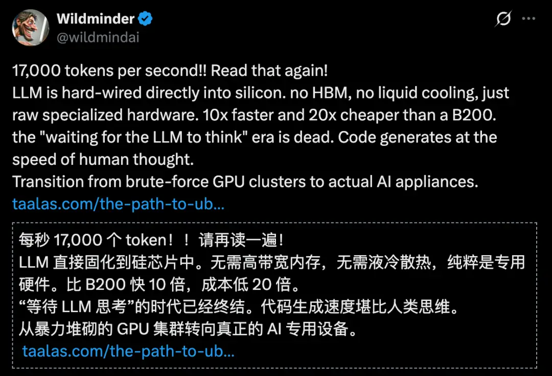 最近刷到一条挺“炸裂”的消息:多伦多一家初创公司 Taalas 做了一颗 HC1 芯片,宣称跑 Llama 3.1 8B 能到 17,000 tokens/秒。