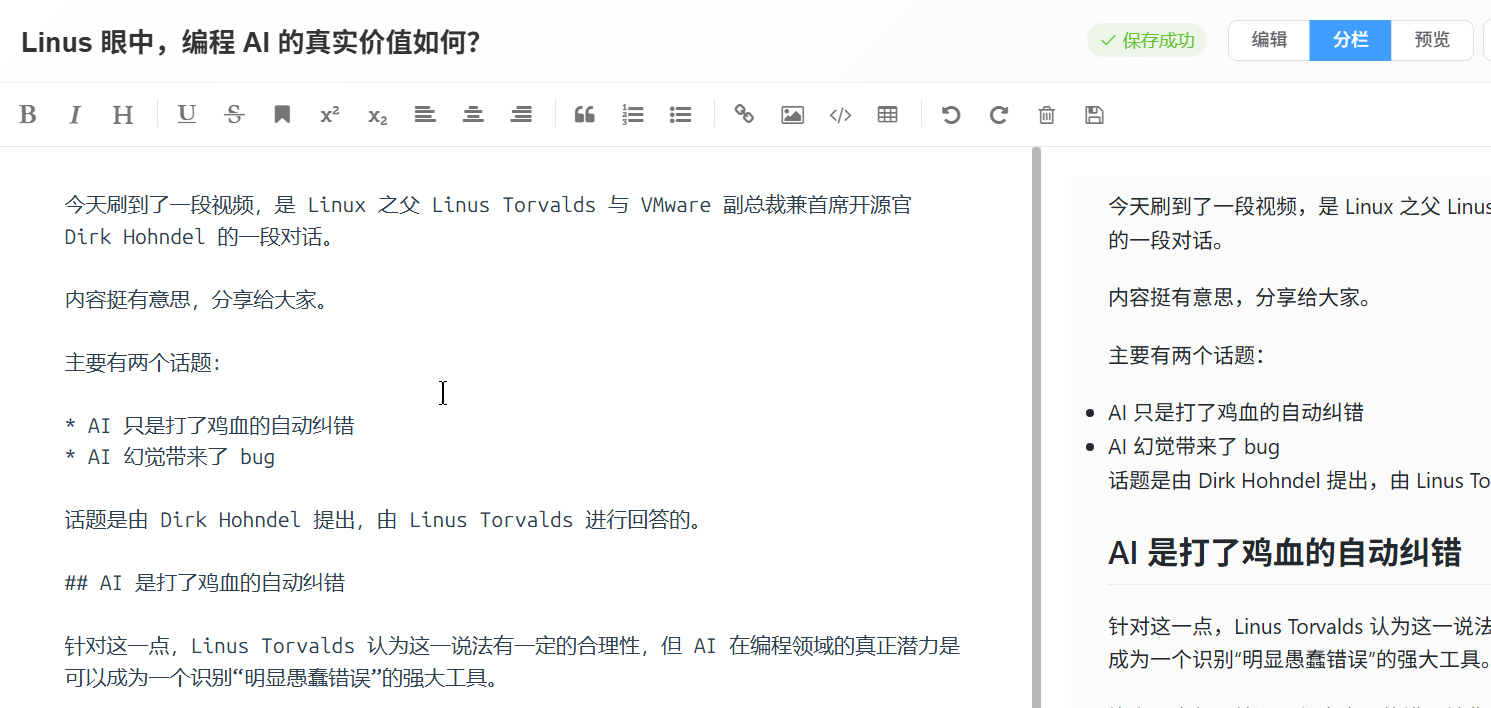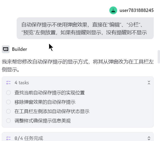自动保存提示不使用弹窗效果,直接在“编辑”、“分栏“、“预览”左侧放置,如果有提醒则显示,没有提醒则不显示过程