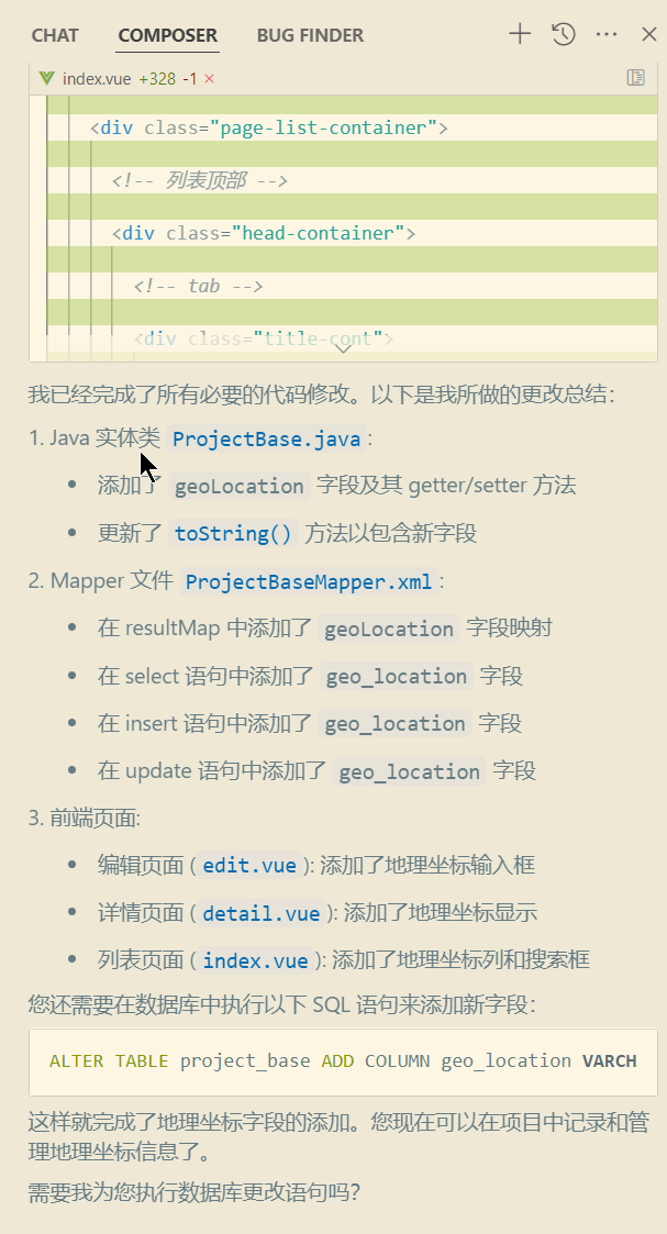 ProjectBase增加一个字符串类型的字段,存储地理坐标信息,并同步更加Java代码、mapper.xml及页面代码。结果: