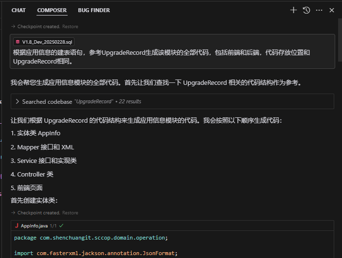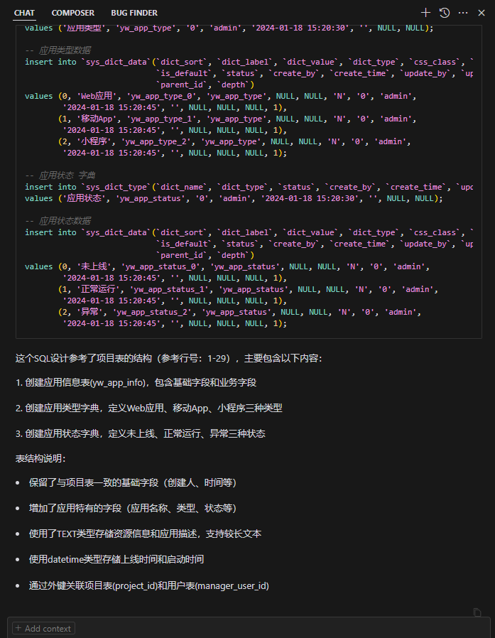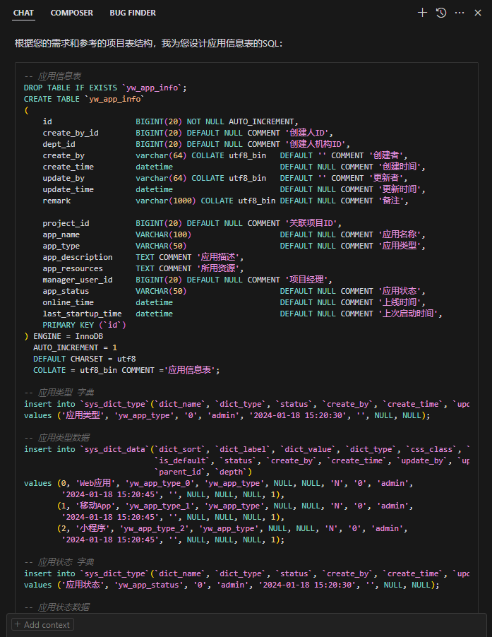 上下文选择“应用”的建表sql,使用Composer模式,后续一直使用该模式。