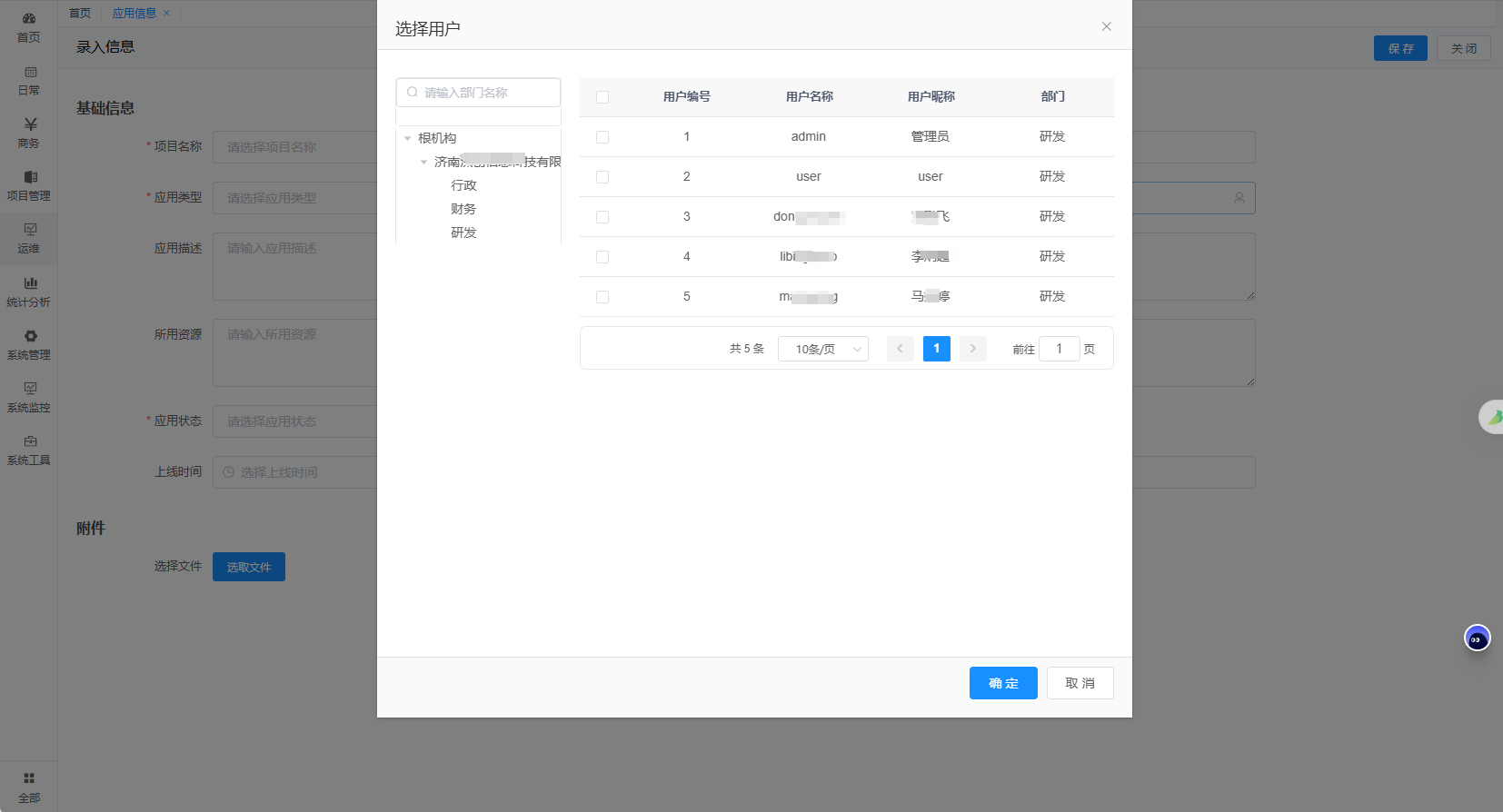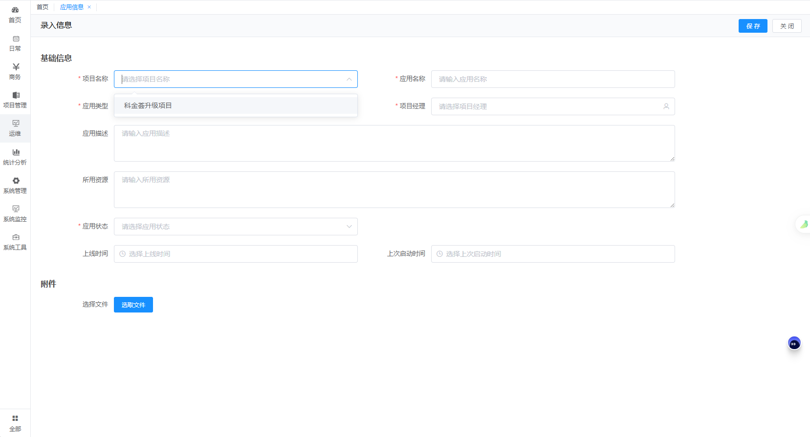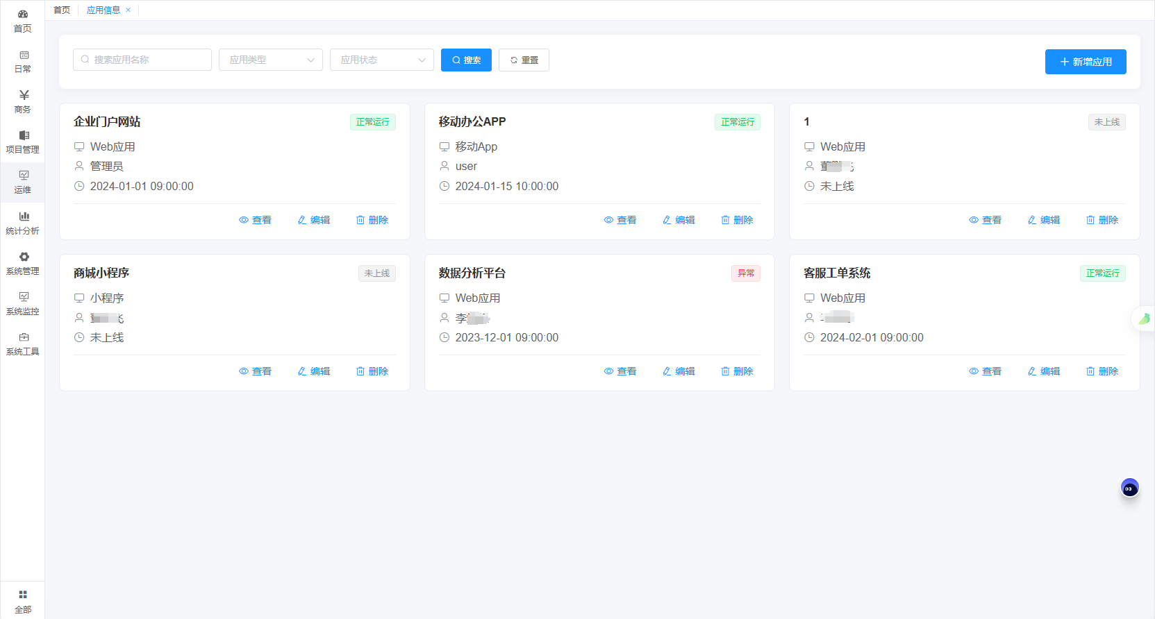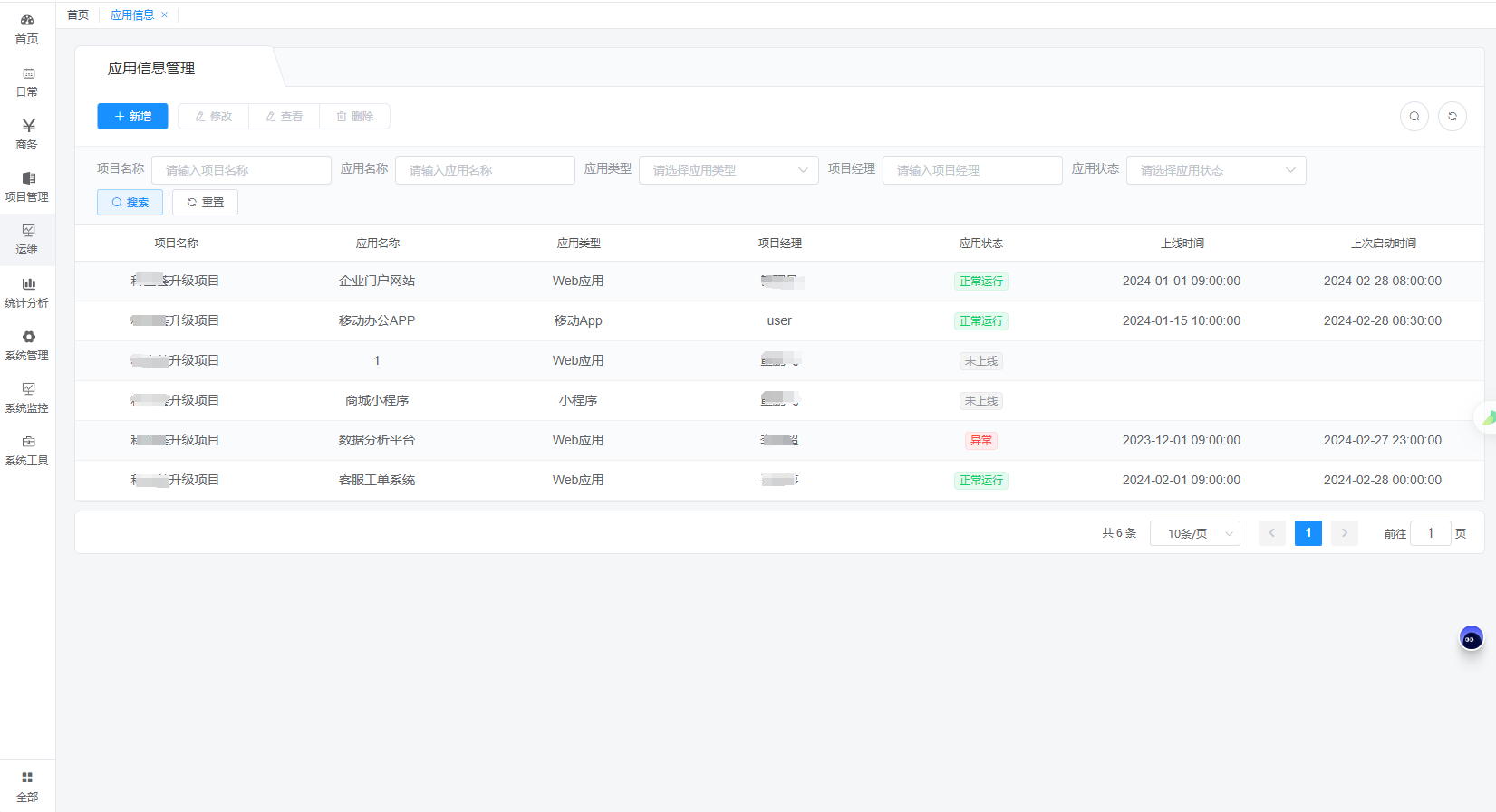 - 实现应用信息的基础管理(增删改查),包括:关联的项目、所用资源(服务器等)、项目经理、应用名称、应用描述、应用类型(Web、App、小程序)、应用描述、应用状态(未上线、正常运行、异常)、上线时间、上次启动时间、备注。
