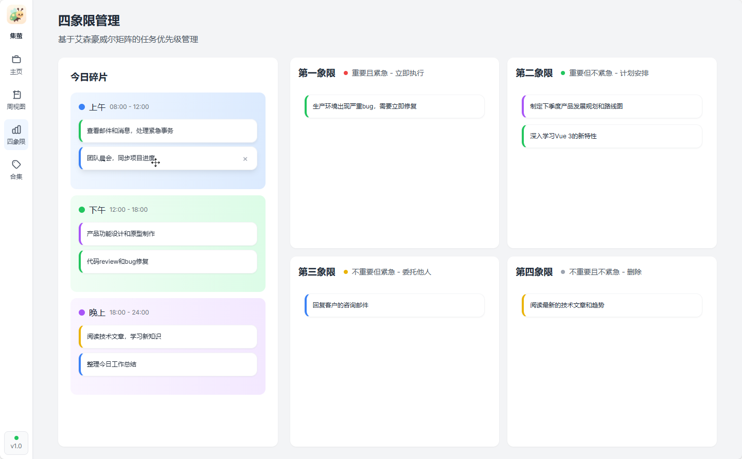 @Quadrant.vue 今日碎片显示的就是contents数据,四象限内也是显示contents数据(根据优先级进行划分,优先级中直接存储1、2、3、4,分别对应四象限的重要且紧急、重要但不紧急等)最终结果