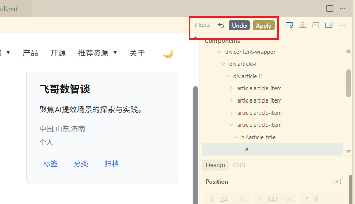 现在有了可视化浏览器,就可以直接点选目标,然后加入对话,进而通过指令进行修改。