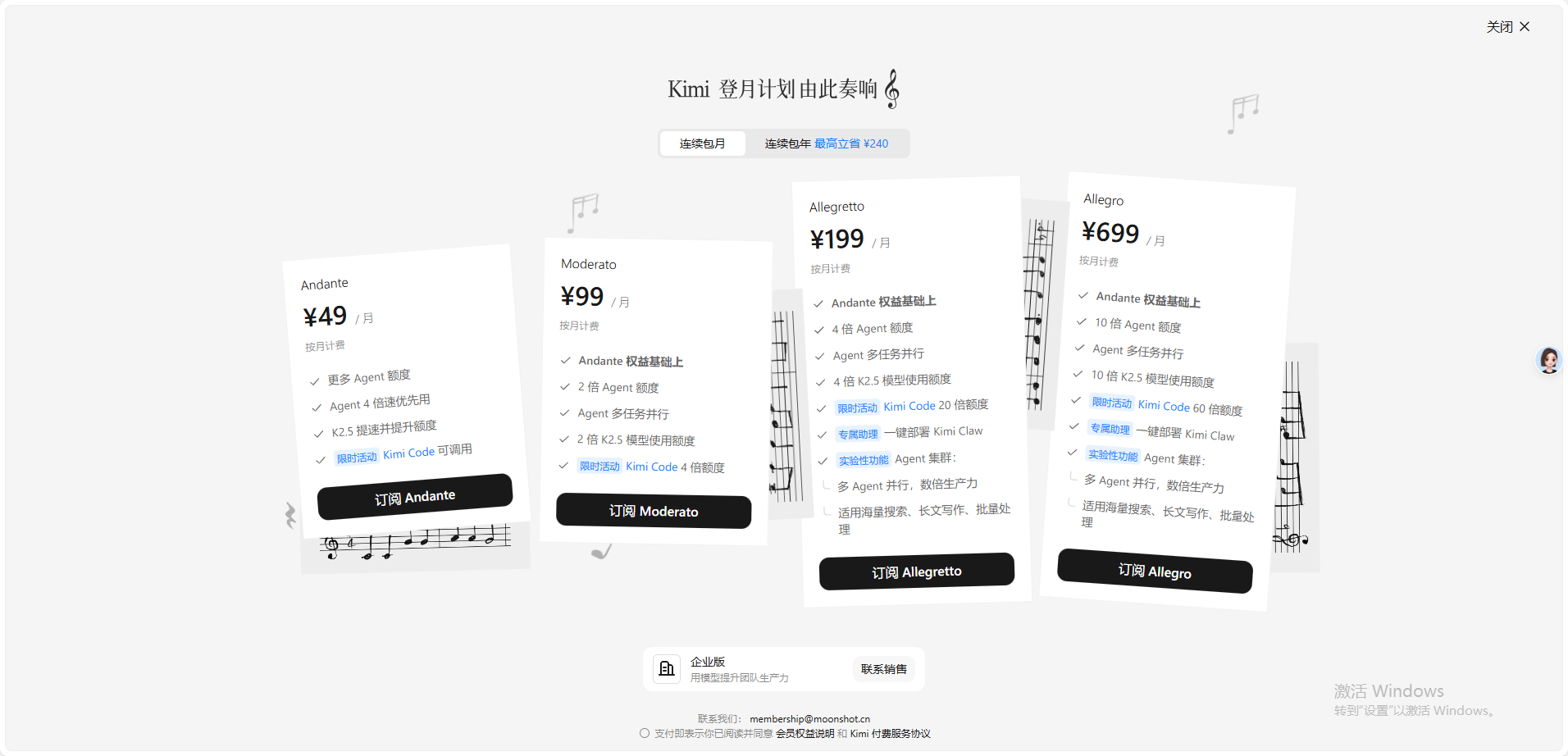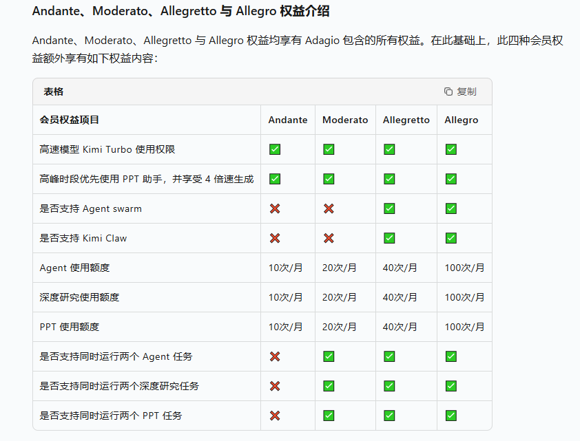 | Kimi | Allegro (进阶版) | 699元/月 | 约 300-1200 次请求 / 5小时 |