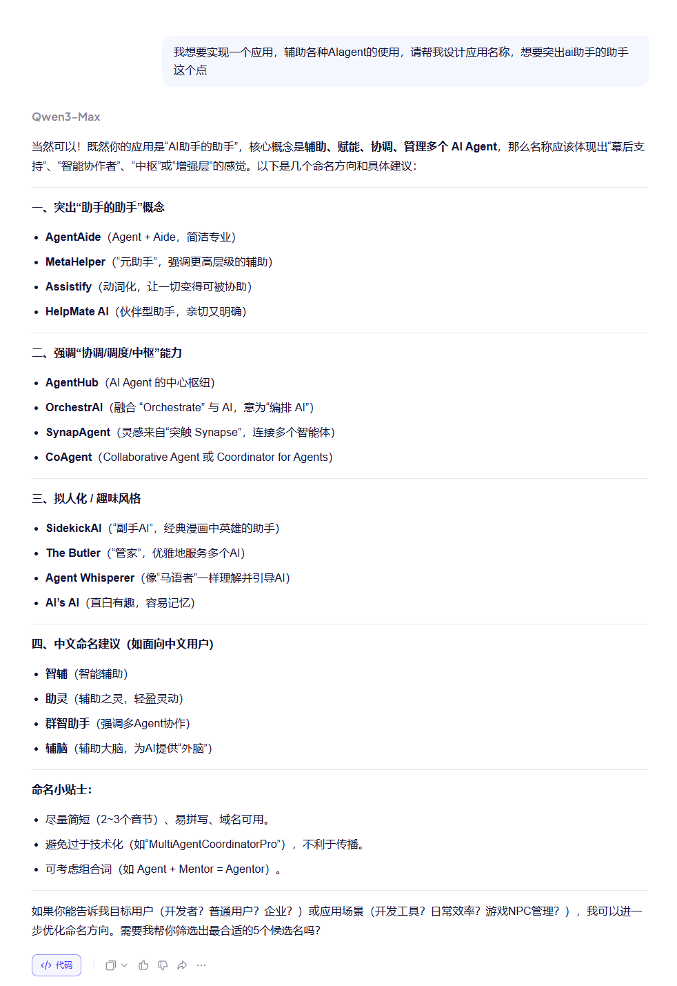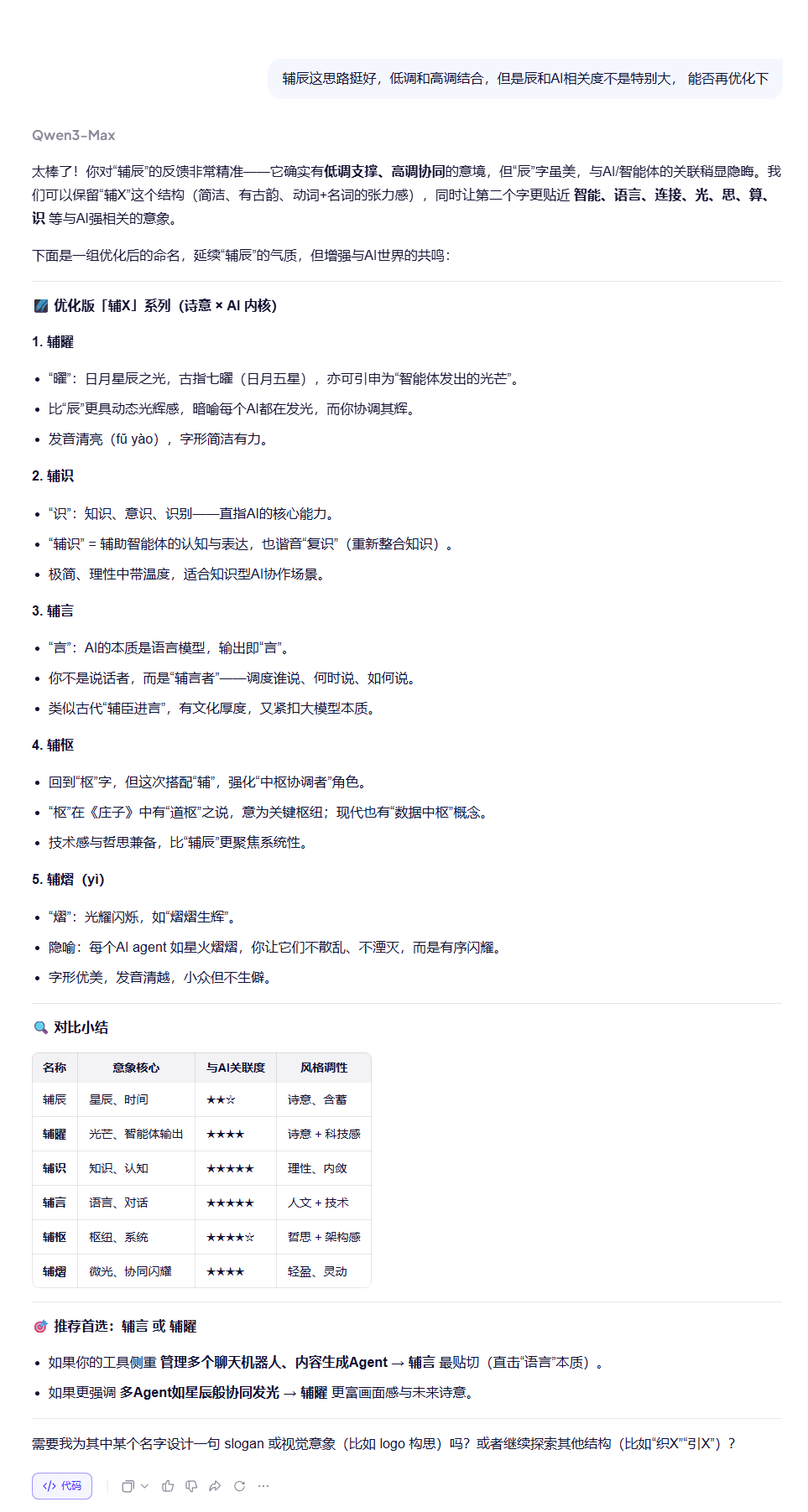 这样,AI 就会自动分析背景知识和取名结果之间的推导思路,进而生成符合我预期的名称。