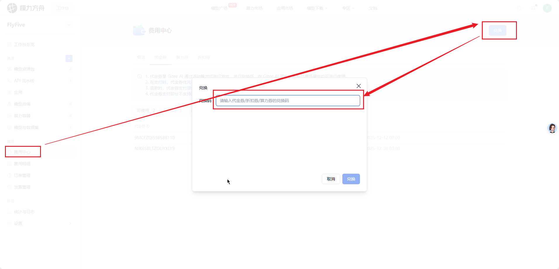2、登录“模力方舟”,打开“控制台”,进行代金券的兑换。