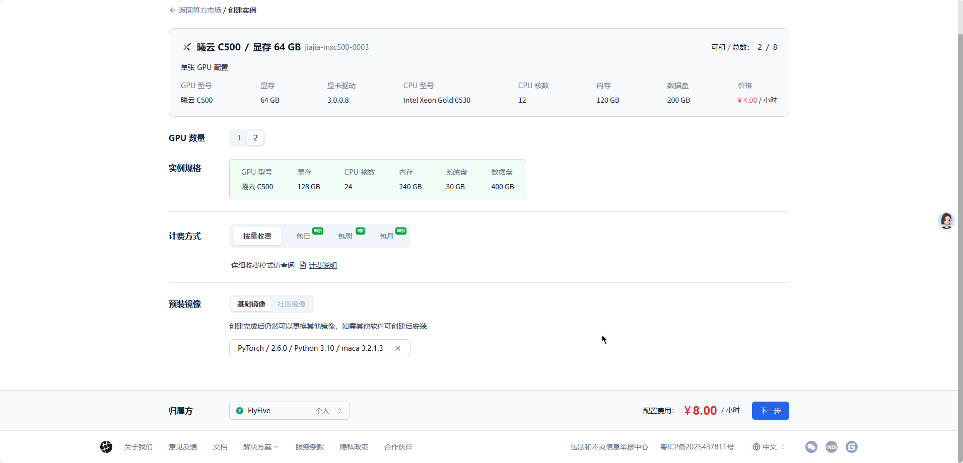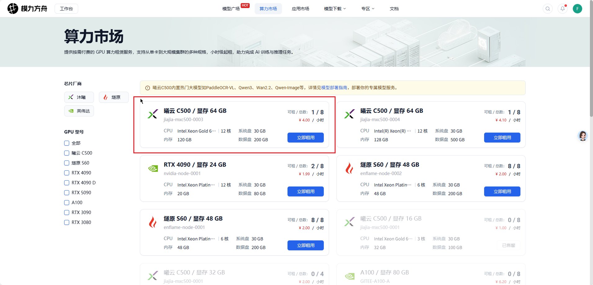 1、访问算力市场:https://moark.com/compute,选择算力,我选择了“曦云 C500/显存 64 GB”。
