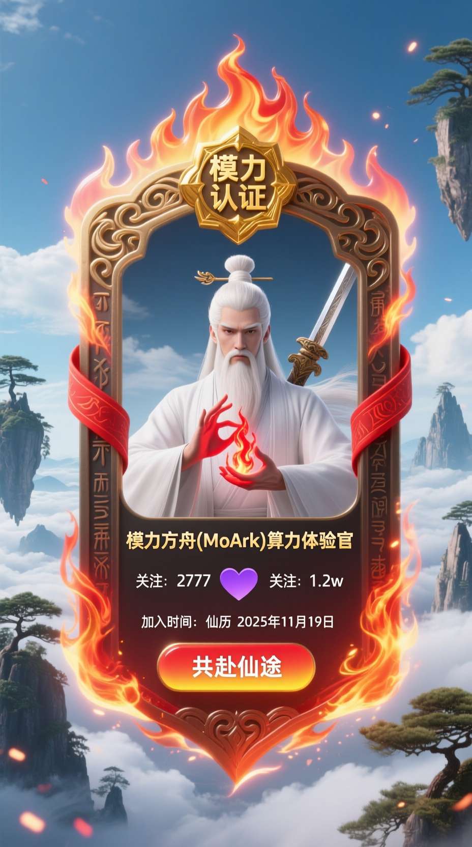 令牌信息区域:顶部金色 “模力认证” 徽章闪烁;名称为 “模力方舟(MoArk)算力体验官”,字体为仙侠风金色立体字;关注数 “2777”、被关注数 “1.2w”(被关注图标为紫色仙心);加入时间 “仙历 2025年11月19日”;底部 “共赴仙途” 按钮为红黄渐变柔光质感。