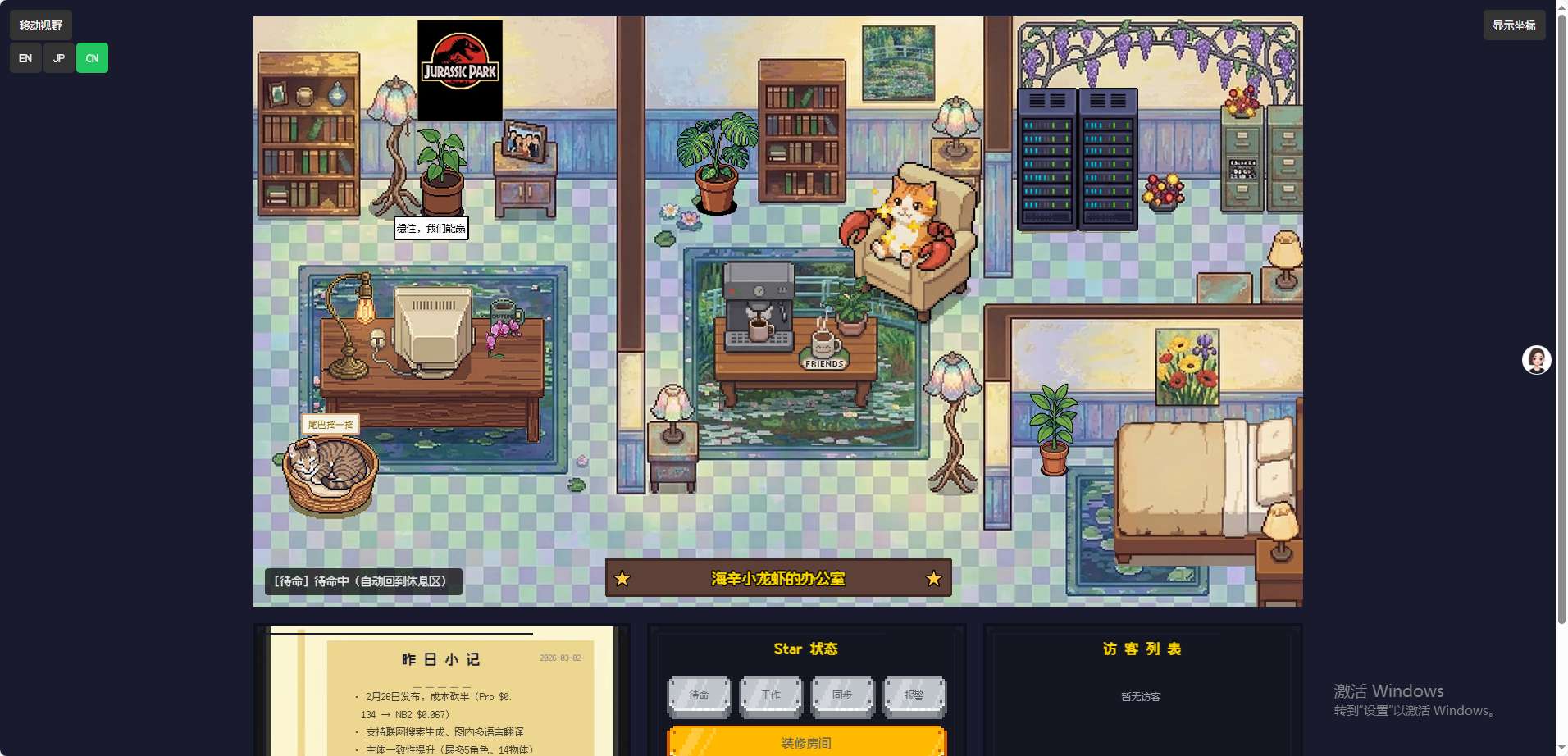 思路一:龙虾目前只能根据有限的工作状态展示,按照这种有限状态机的思路,桌宠确实更合适一点,这么大个网页有点浪费,官方倒是有桌宠模式,后续再试试。