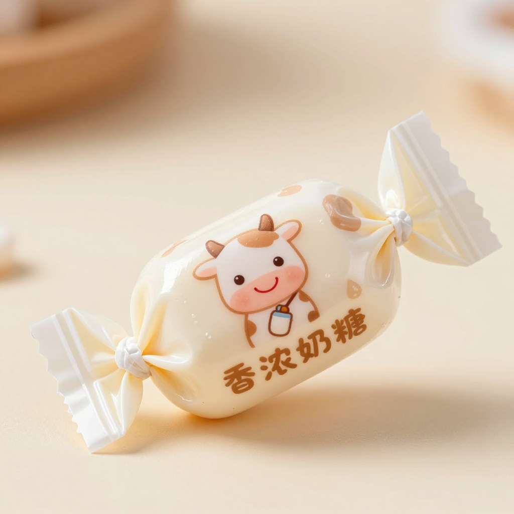 单粒牛奶硬糖,经典两端扭结包装,儿童风,奶白色为主色调,点缀浅棕色小奶牛斑点,包装正面印 Q 版微笑小奶牛(圆眼睛、短耳朵、脖子挂迷你奶瓶),半透明包装纸隐约透出米白色奶糖本体(糖体光滑有光泽),扭结处颜色为淡奶油色,包装纸呈柔和哑光质感,带轻微奶泡珠光,侧面印微型奶滴图案,正面下方用圆润卡通字体写 “香浓奶糖”,整体无尖锐棱角,色彩柔和不刺眼,暖光照射,8k 高清,细节丰富,适合 3-10 岁儿童结果