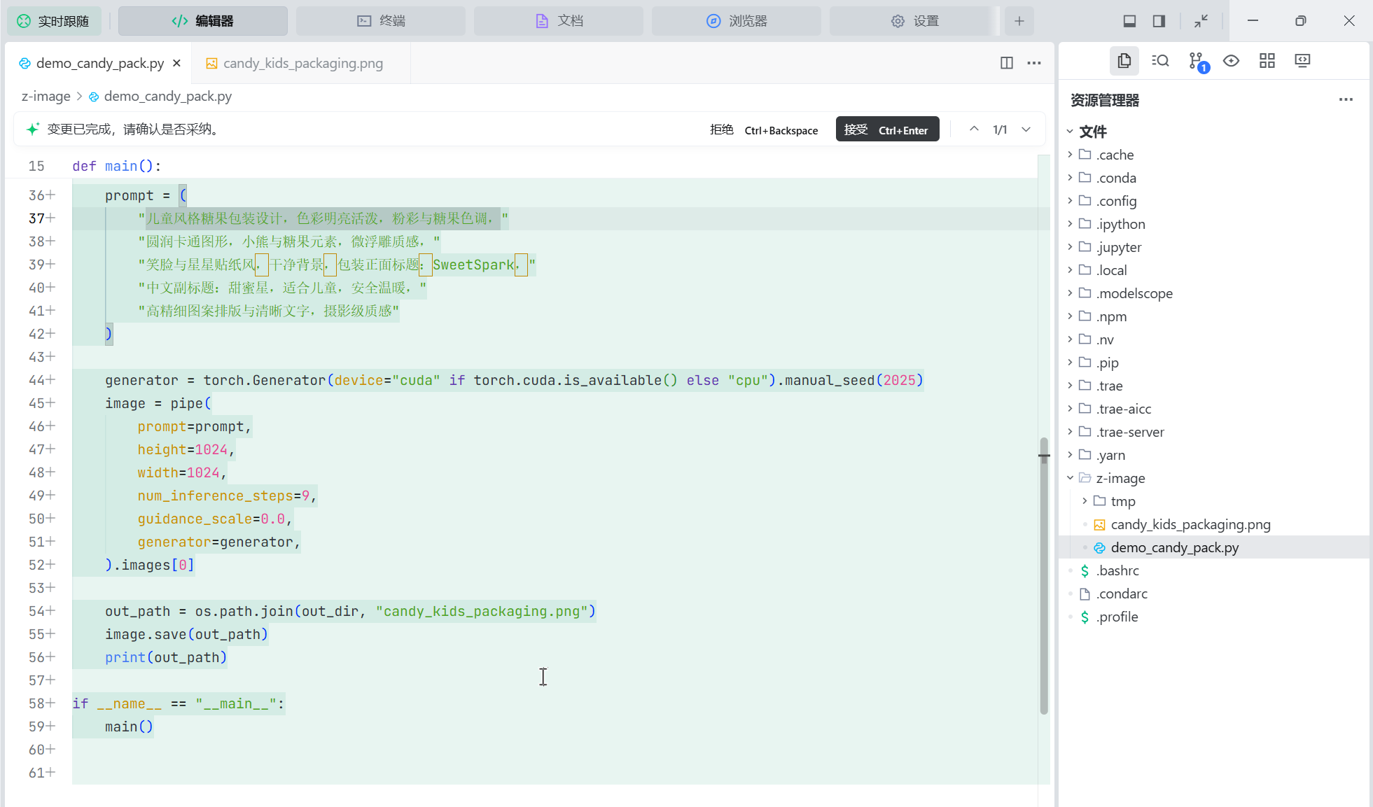 下面是生成的 demo 脚本,可以看到采用的 Z-Image 模型。