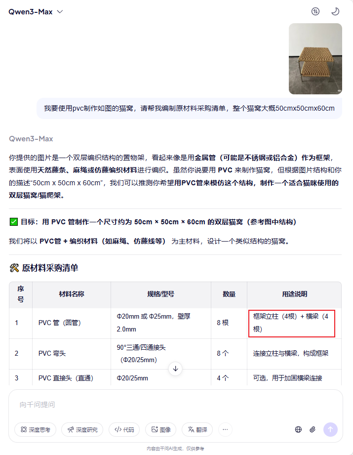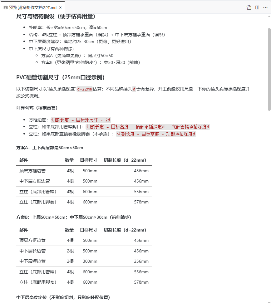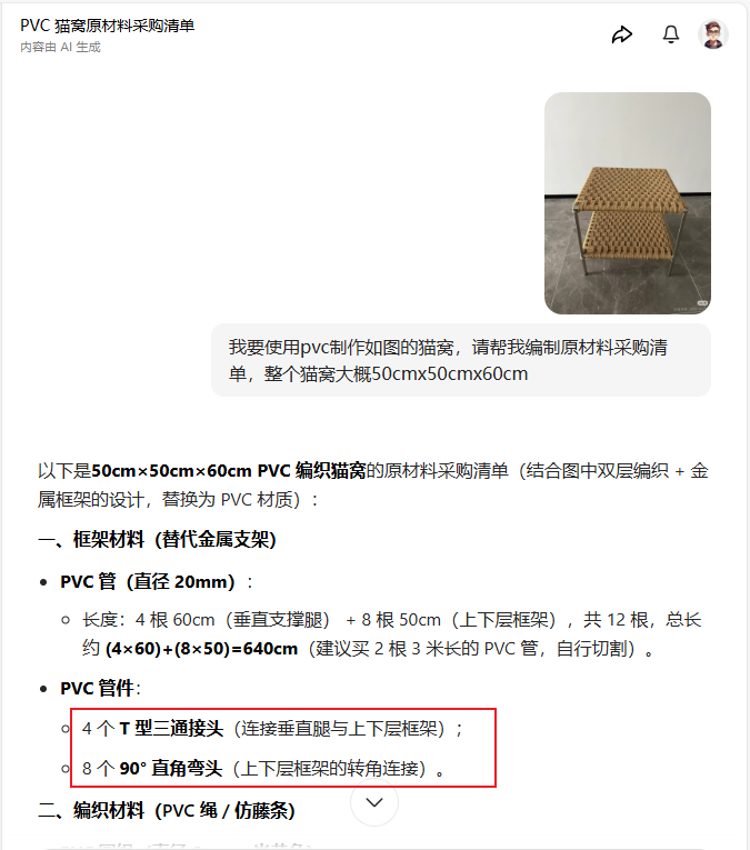 我要使用pvc制作如图的猫窝,请帮我编制原材料采购清单,整个猫窝大概50cmx50cmx60cm千问