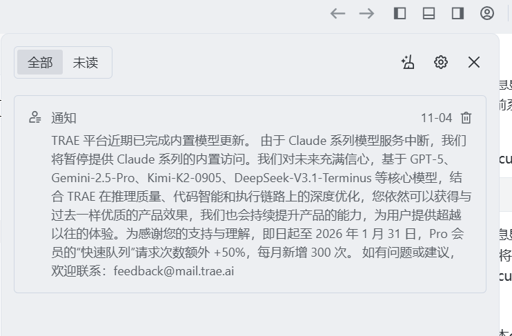 为了弥补 Pro 会员,TRAE 主动给大家提供了补偿机制:即日起至 2026 年 1 月 31 日,Pro 会员每月“快速队列”请求次数+50%,每月新增300次。