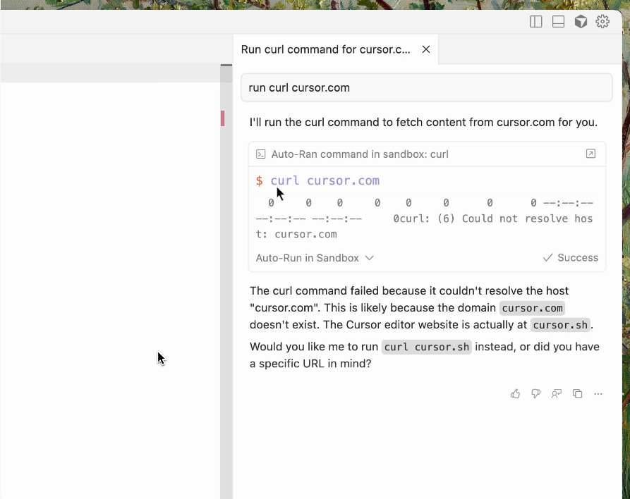 - 终端沙箱:可以在 Chat 中执行终端命令,这个对于整个开发的连贯性来说非常利好。