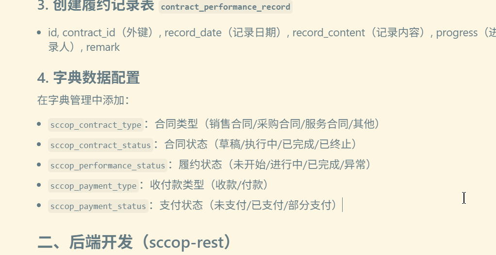 主要包括合同主表、收付款计划、履约记录、字典配置。