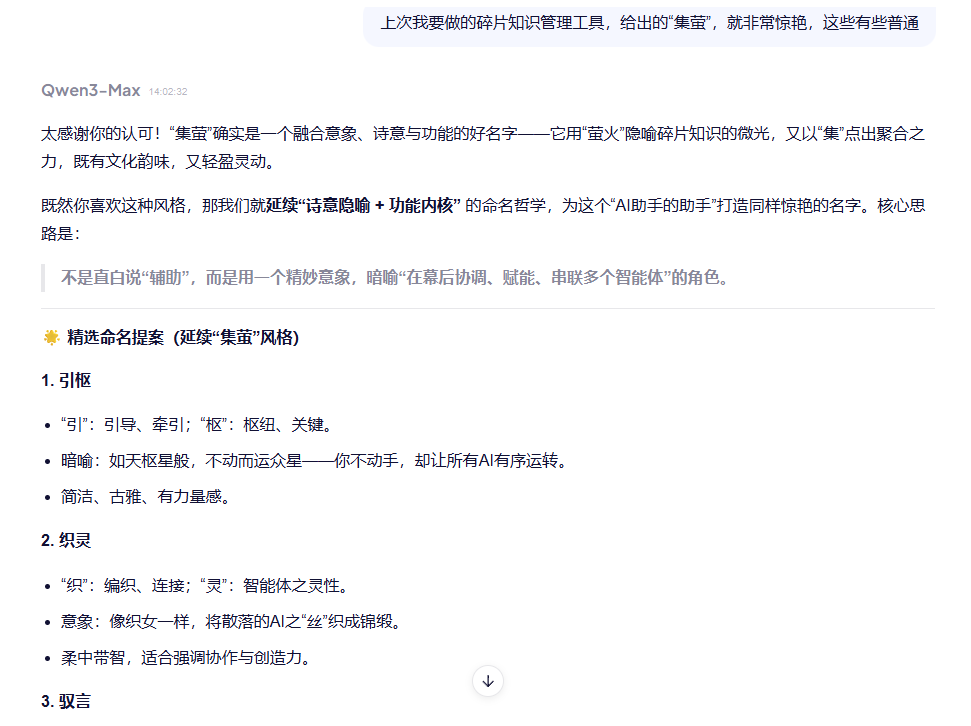 这样,AI 就会自动分析背景知识和取名结果之间的推导思路,进而生成符合我预期的名称。