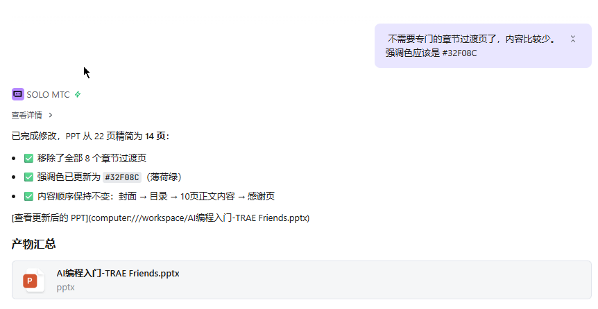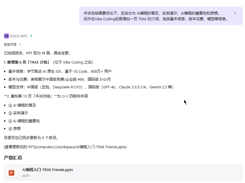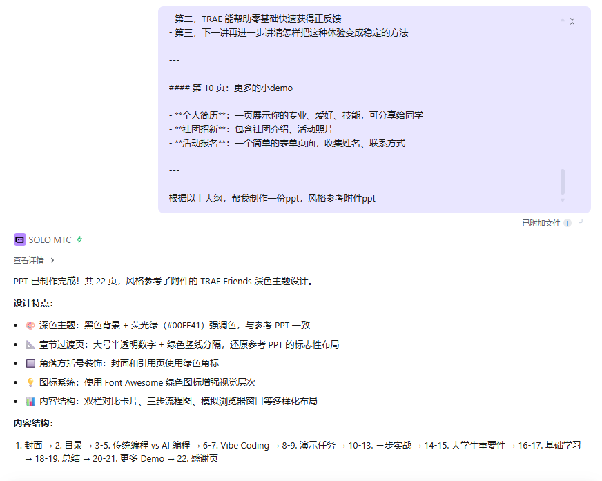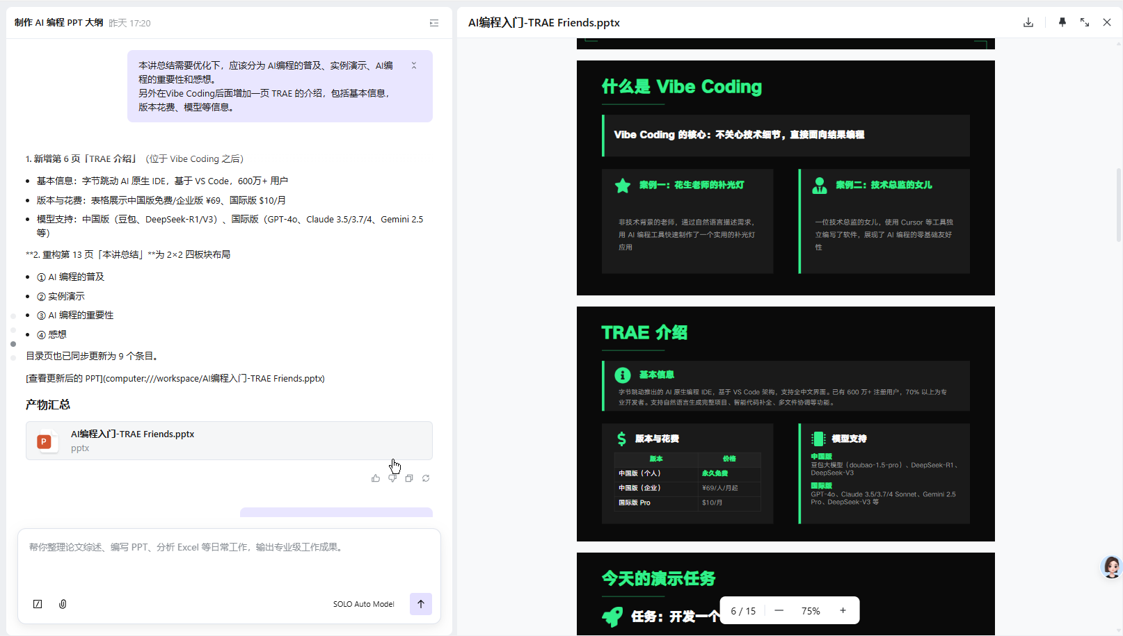 然后就是把第一讲的大纲复制给 SOLO,参考模板生成新的 PPT。