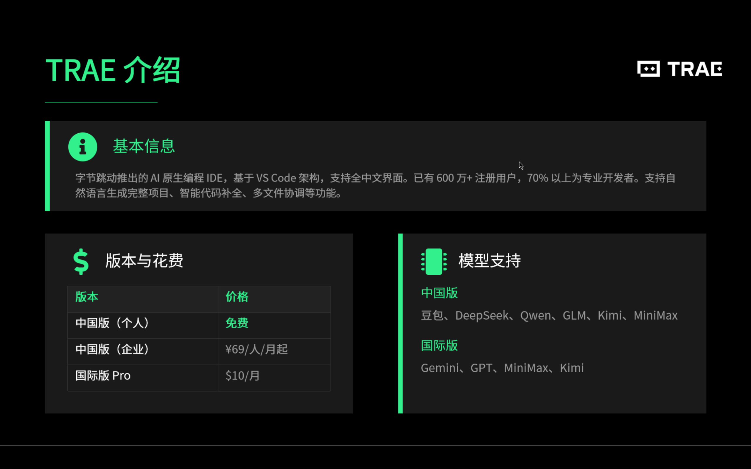 另外在Vibe Coding后面增加一页 TRAE 的介绍,包括基本信息,版本花费、模型等信息。