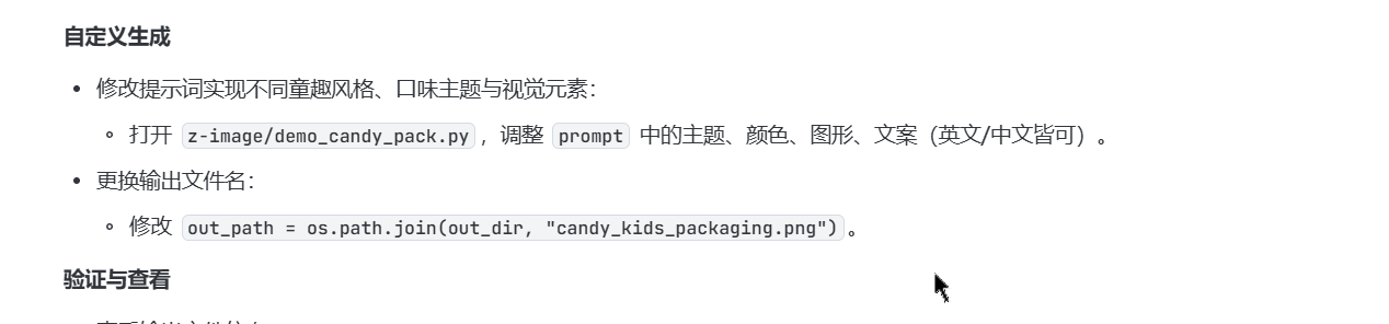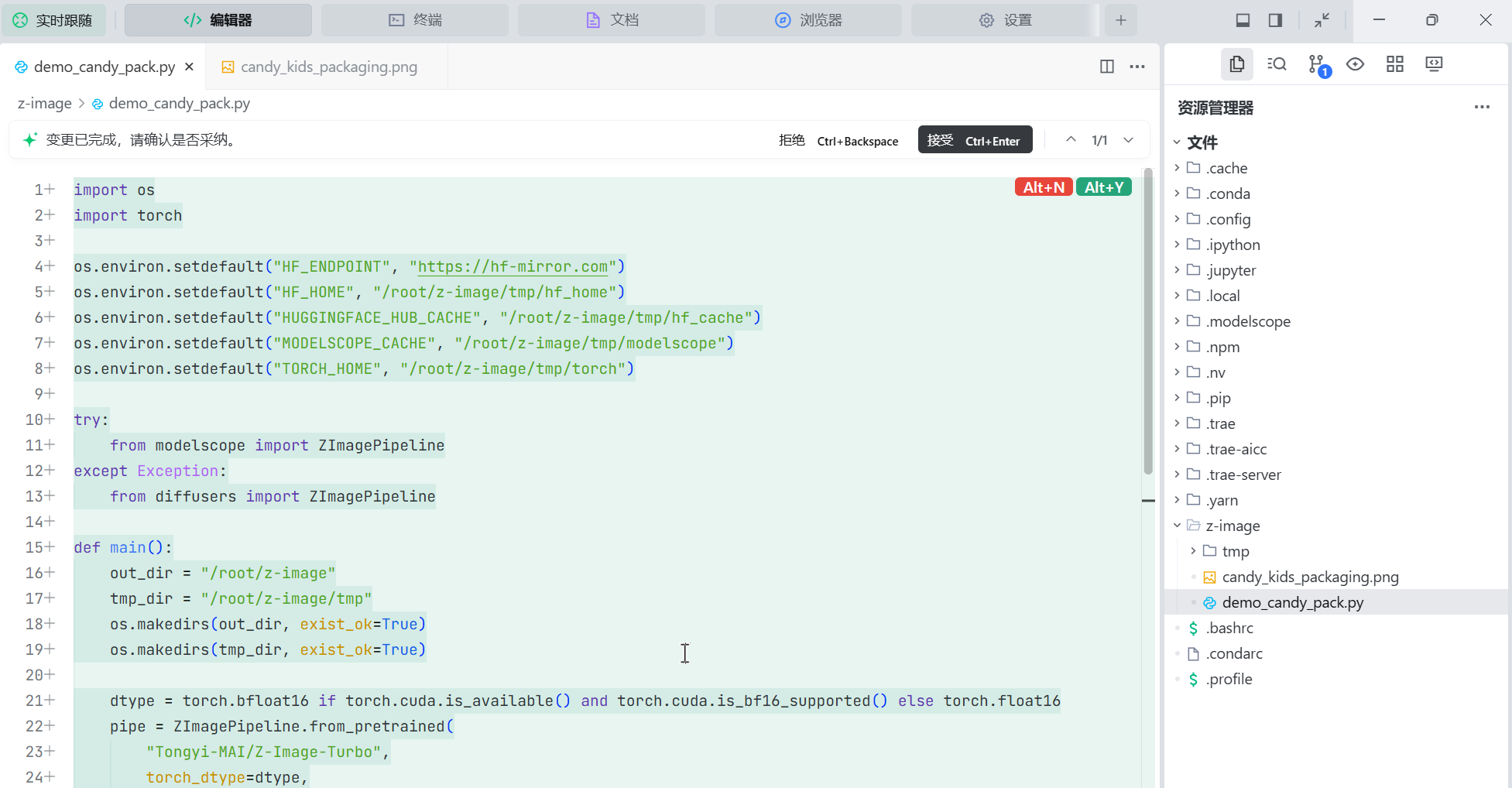 下面是生成的 demo 脚本,可以看到采用的 Z-Image 模型。